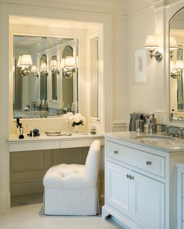 The nook also allows you to put up mirrors on all three sides, like in this example, which is great for getting ready in the morning. It also keeps your bathroom sink clear of things.